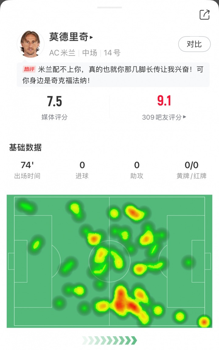 莫德里奇9月9日就将满40岁,本场比赛他首发出战74分钟,热区图覆盖全场。2射门1射正,送出3次关键传球,传球成功率90.8%,还有2解围1拦截,媒体评分7.5。